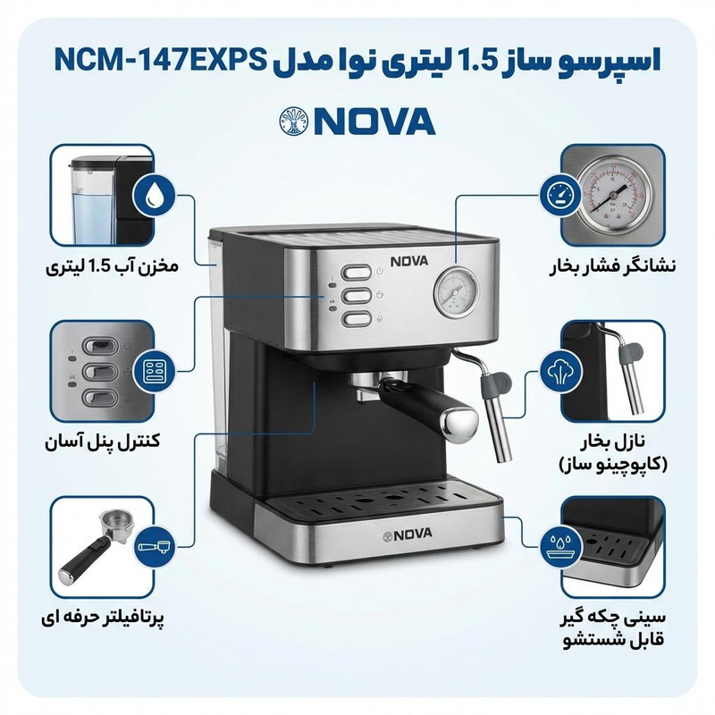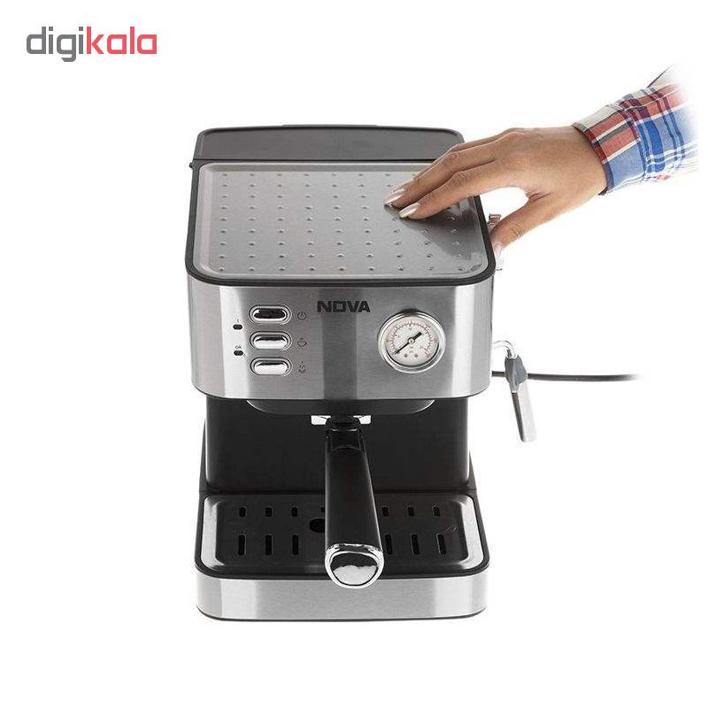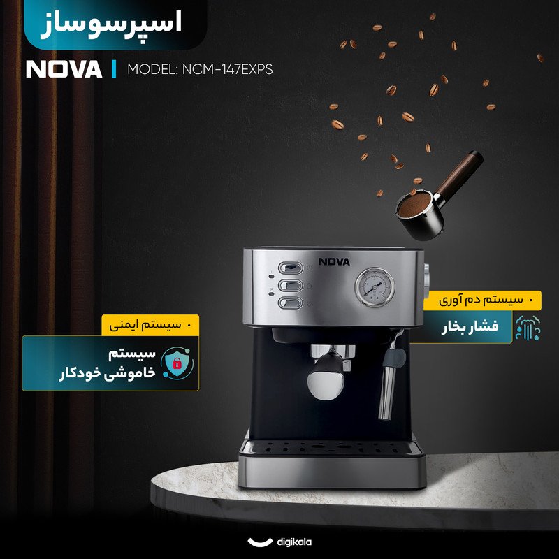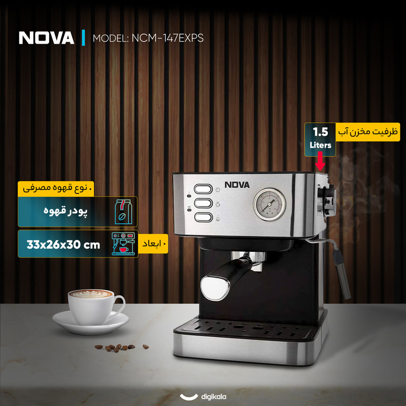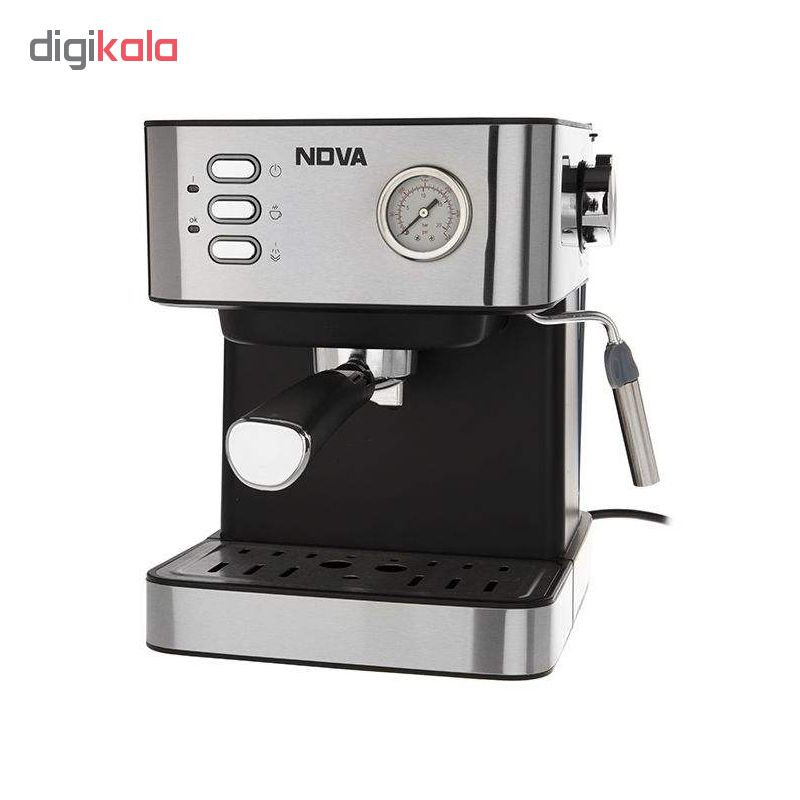 دستگاه اسپرسوساز ندوا مدل NCM-147EXPS با گرمای و فشار بخار 15 بار نشان دهنده ی قدرت بسیار خوب است. اسپرسوساز ندوا مدل NCM-147EXPS با فشار بخار 15 بار و با ظرفیت توان 850 وات مجهز به نشانگر فشار پمپ ،سیستم قطع دستی و نازل تولید بخار و آب جوش است که از آن برای تهیه کاپوچینو و کف شیر و انواع نوشیدنیهای گرم استفاده می شود. در مدل اسپرسوساز ندوا مدل NCM-147EXPS نازل بخار قابل چرخش طراحی شده است . اسپرسوساز ندوا مدل NCM-147EXPS آبِ جوش را با فشار خیلی زیاد از بین دانههای قهوهٔ آسیاب شده ریز میگذراند. قهوه اسپرسو غلیظتر از قهوههای دیگر بوده را خارج می کند و نوش جان کنید.اسپرسوساز ندوا NDVA NCM-147EXPS مجهز به صفحه ی گرم نگهداره ی فنجان است که به شما کمک میکند تعداد بیشتری فنجان قهوه را پیش گرم کنید و از نوشیدن یک فنجان اسپرسو خوب لذت ببرید.در این دستگاه از بویلر و پمپ آب قویتری استفاده شده است که بر روی درجه حرارت قهوه خروجی و همچنین بخار آب تاثیر گذار است. اسپرسوساز ندوا مدل NCM-147EXPS مناسب مصارف خانگی و یا کافه های کوچک است .