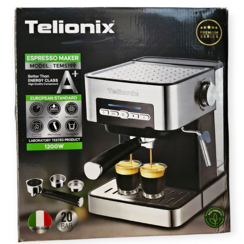 امروزه افراد زیادی علاقمند به تهیه انواع نوشیدنی داغ مانند قهوه و اسپرسو هستند که اسپرسوساز تلیونیکس مدل TEM5199 با قدرت فوق العاده 20 بار در این زمینه به شما کمک بسیاری می کند. مصرف روزانه یک فنجان قهوه به دلیل کالری بسیاری پایین تاثیر بسزایی در کاهش وزن نیز به همراه دارد. این اسپرسوساز دارای بدنه ای از جنس استیل به شکل براق که زیبایی محصول را دوچندان نموده است. بر روی اسپرسوساز تلیونیکس مدلTEM5199 چند کلید طراحی شده است که توسط این کلیدها میتوان تنظیمات مربوط برای قهوه اسپرسو، کف شیر، کاپوچینو را انجام داد. این دستگاه مجهز به تنظیمات دستی و اتومات می باشد که بنا به نیاز خود آن را انتخاب نمایید. قهوه ساز دارای یک مخزن به گنجایش 1٫6 لیتر می باشد که در پشت دستگاه قابل نصب می باشد. این مخزن به شکلی طراحی شده که میتوان آن را برای شستشو براحتی جدا کرد. این محصول مجهز به تولید بخار و آب جوش می باشد که برای تهیه انواع نوشیدنی های داغ مورد استفاده قرار می گیرد. با استفاده از دو فیلتر تک و دوبل قابلیت آماده سازی یک تا دو فنجان قهوه را نیز دارد.این محصول با داشتن مخزن آبی که در پشت دستگاه نصب گردیده می توان به اندازه نیاز پر کرد. حال مقداری قهوه که از قبل بوسیله دستگاه آسیاب شده را در سبد دو فنجان اسپرسو جای داد. فشرده سازی قهوه در سبد مورد نظر باعث می شود تا آب جوش به سختی از قهوه عبور کند. در نتیجه باید به وسیله تمپر آن را فشرده نمود و سپس در جایگاه خود به دستگاه نصب کرد. فنجانها را بر روی سینی جلوی اسپرسوساز قرار داده حال کلید مربوطه که روی بدنه طراحی شده را روشن نماید. حال بعد از یک دقیقه قهوه اسپرسوی بسیار غلیظ و با طعمی خوش را می توان به عنوان یک نوشیدنی داغ میل نمود. کیفیت و غلظت قهوه تهیه شده با این دستگاه مثال زدنی می باشد.