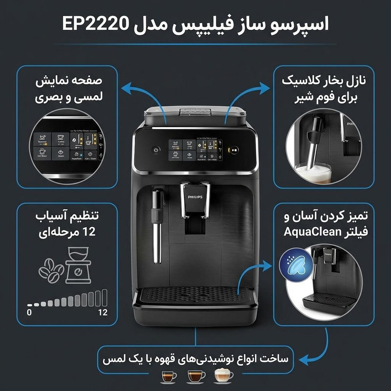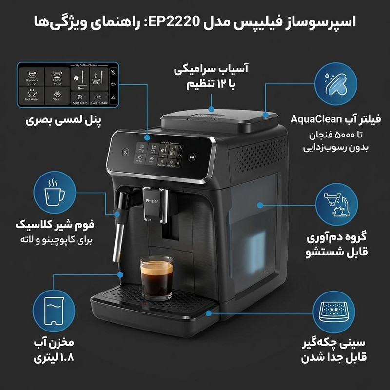 اسپرسوساز Philips مدل EP2220/10 یک دستگاه اتوماتیک با طراحی کاربرپسند است که تجربهای حرفهای از تهیه قهوه را در خانه به ارمغان میآورد. این دستگاه با فشار بخار ۱۵ بار و توان ۱۵۰۰ وات، به شما این امکان را میدهد که اسپرسوهای خوشمزه و غنی با طعمی بینظیر داشته باشید. مخزن آب ۱.۸ لیتری آن به شما این امکان را میدهد که چندین فنجان قهوه را بدون نیاز به پر کردن مجدد دستگاه تهیه کنید. همچنین، سیستم AquaClean این دستگاه امکان استفاده از آن تا ۵۰۰۰ فنجان بدون نیاز به رسوبزدایی را فراهم میآورد.