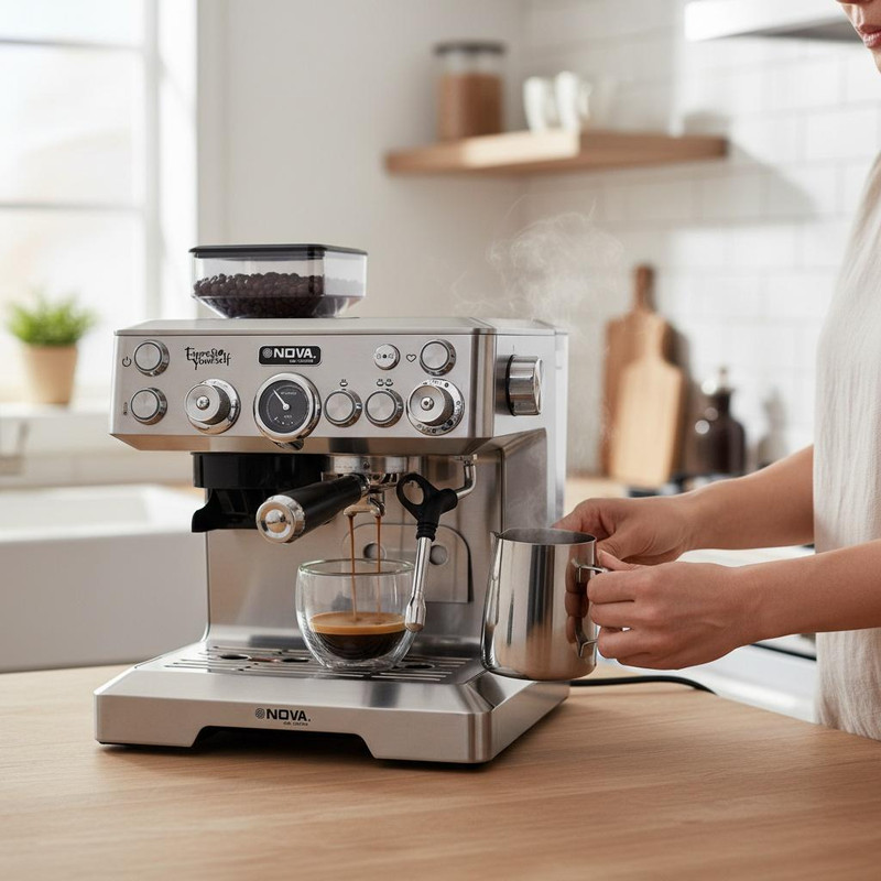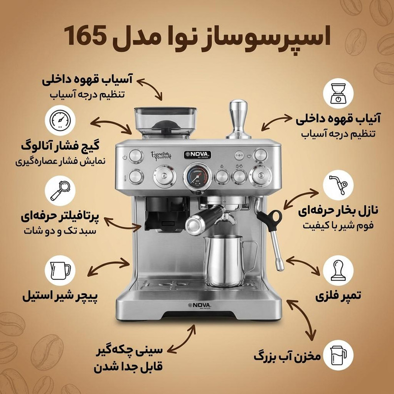 اسپرسوساز نیمه صنعتی نوا مدل 165 یکی از جدیدترین و پر طرفدار ترین محصولات شرکت نوا است. این محصول ویژگیهای ظاهری و عملکردی زیادی دارد که موجب شده است این محصول جزء قدرتمندترین اسپرسوسازها به شمار رود. از جمله قابلیتها و امکانات این محصول میتوان به مجهز بودن به آسیاب سرخود، پرتافیلتر صنعتی، گنجایش زیاد مخزن آب، نازل بخار و نازل آبجوش اشاره کرد. این دستگاه با توان مصرفی 2500 واتی خود میتواند در اسرع وقت نوشیدنی مورد علاقه شما را با بالاترین کیفیت آماده کند. این غول برند نوا دارای قابلیتهای دیگری مثل سیستم قطع کن خودکار، سیستم خنکسازی اتوماتیک، سیستم برنامه ریزی و قابلیتهای متنوع دیگری است که ارزش خرید این محصول را به شدت بالا میبرد. از ویژگی های این دستگاه میشه به : کیفیت ساخت بالا,قطع کن خودکار,آسیاب قابل تنظیم ,عصاره گیری چند حالته,سیستم خنک کننده خودکار ,گیج فشار ,قابلیت تنظیم زمان عصاره گیری اشاره کرد.از قابلیتهای منحصر به فرد این مدل، امکان تهیه قهوه اسپرسو و آمریکانو و لانگو و قهوه سرد به صورت اتوماتیک می باشد.