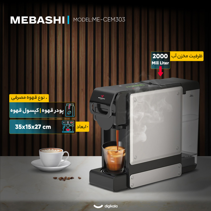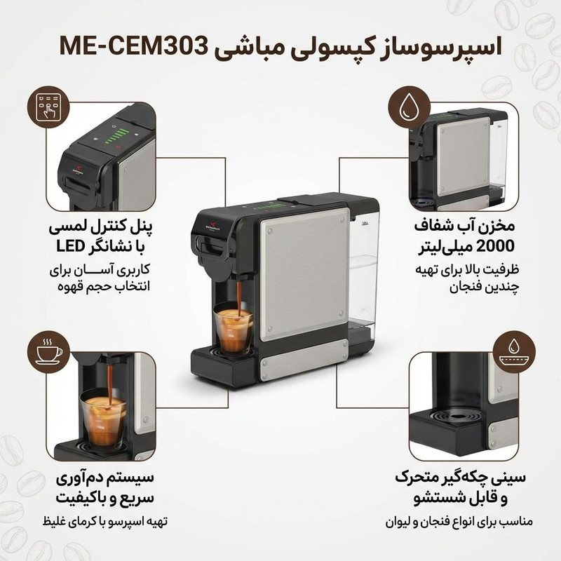اسپرسو ساز ۲۰۰۰ میلیلیتر مباشی مدل ME-CEM303 یک دستگاه چندکاره تماماتوماتیک است که برای استفاده خانگی طراحی شده و با ترکیب عملکرد سریع، کاربری ساده و تنوع در نوع قهوه مصرفی، به انتخابی مناسب برای تهیه نوشیدنیهای روزانه تبدیل شده است. اسپرسو ساز ۲۰۰۰ میلیلیتر مباشی مدل ME-CEM303 با ابعاد 35x۱۵x۲۷ سانتیمتر و وزن ۳.۵ کیلوگرم بدنهای از استیل و پلاستیک دارد که ضمن حفظ استحکام، ظاهر دستگاه را مدرن و سبک نگه میدهد. مخزن آب با ظرفیت ۲۰۰۰ میلیلیتر بزرگترین بخش دستگاه را تشکیل میدهد و برای مصرف روزانه خانوادگی کاملاً کافی است.