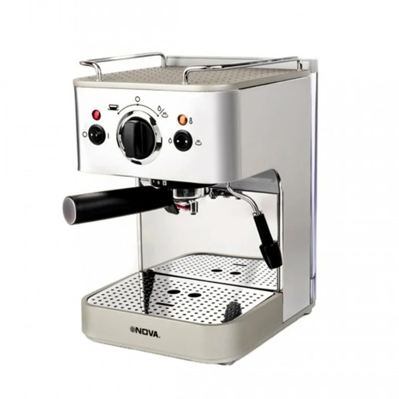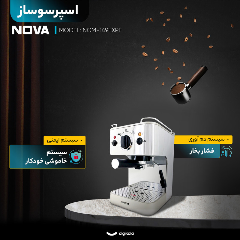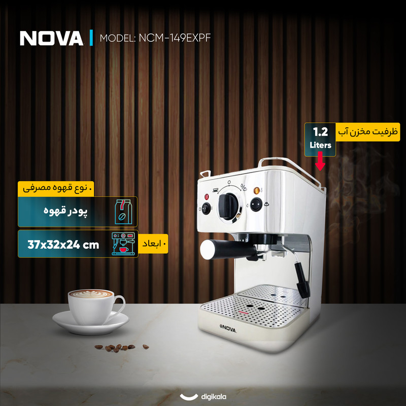 اسپرسوساز نوا 149 NOVA با طراحی عالی یک دستگاه پر قدرت و کاملاً کاربردی برای مصارف خانگی و یا کافه های کوچک است.اسپرسو ساز نوا 149 با قدرت بخار 15 بار یک قهوه ساز و اسپرسو ساز قوی محسوب می شود.اسپرسو خارج شده از این دستگاه با کرمای عالی نشان دهنده ی قدرت بسیار خوب نوا 149 است.نوا 149 مجهز به نازل تولید بخار و آب جوش است که از آن برای تهیه کاپوچینو و کف شیر و انواع نوشیدنیهای گرم استفاده میشود.در مدل نوا 149 نازل بخار قابل چرخش طراحی شده است که استفاده از آن را ساده کرده است. همچنین نوا 149 مجهز به صفحه ی گرم نگهداره ی فنجان بزرگتری نسبت به نوا 139 است که به شما کمک میکند تعداد بیشتری فنجان قهوه را پیش گرم کنید و از نوشیدن یک فنجان اسپرسو خوب لذت ببرید.بدنه نوا 149 از استیل براق ضد زنگ ساخته شده که زیبایی آن را دو چندان کرده است.در این دستگاه از بویلر و پمپ آب قویتری نسبت به مدلهای 139 و 140 استفاده شده است که بر روی درجه حرارت قهوه خروجی و همچنین بخار آب تاثیر گذار است.نوا 149 نیز مانند نوا 139 و 140 دارای دو فیلتر قهوه تک و دوبل است که شما میتوانید از آنها استفاده کنید.