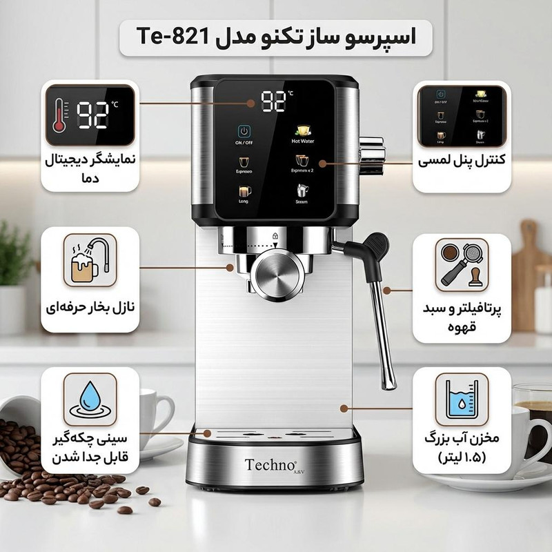 اسپرسو ساز Te-821 مجهز به فناوریهای پیشرفتهای است که آن را به یک اسپرسوساز منحصر به فرد تبدیل میکند. پمپ قدرتمند 15 بار این اسپرسوساز، فشار ایدهآلی برای عصاره گیری کامل قهوه و تهیهی اسپرسویی غلیظ و خامهای را فراهم میکند. سیستم گرمایش سریع اسپرسو ساز Te-821 در عرض چند ثانیه گرم میشود و می توانید در کمترین زمان ممکن از قهوهی خود لذت ببرید.