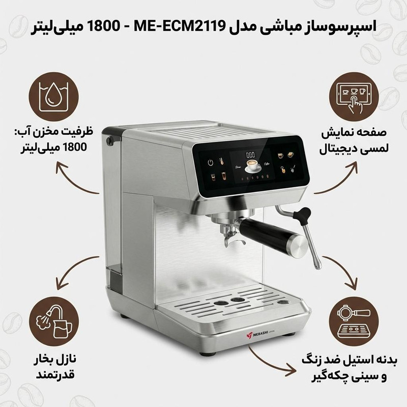 اسپرسوساز مباشی مدل ME‑ECM2119 یکی از مدلهای خوشساخت و کارآمد این برند ژاپنی است که برای استفاده خانگی طراحی شده و در میان رده دستگاههای نیمهحرفهای جای میگیرد. این دستگاه با ترکیب طراحی مدرن و عملکرد قدرتمند خود، گزینهای مناسب برای دوستداران قهوه باکیفیت در خانه است. بدنه استیل دستگاه علاوه بر دوام بالا، جلوهای لوکس به فضای آشپزخانه میدهد و در برابر ضربه و حرارت مقاومت قابل توجهی دارد.