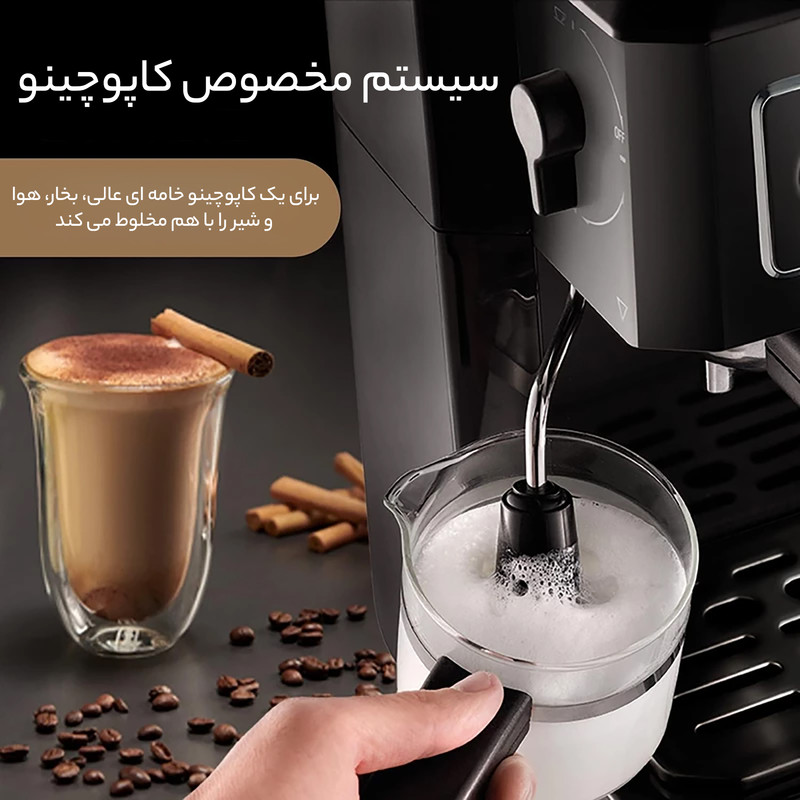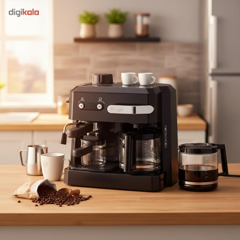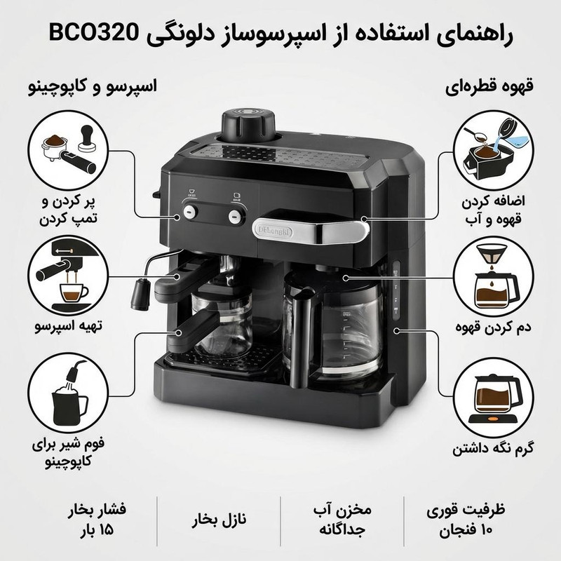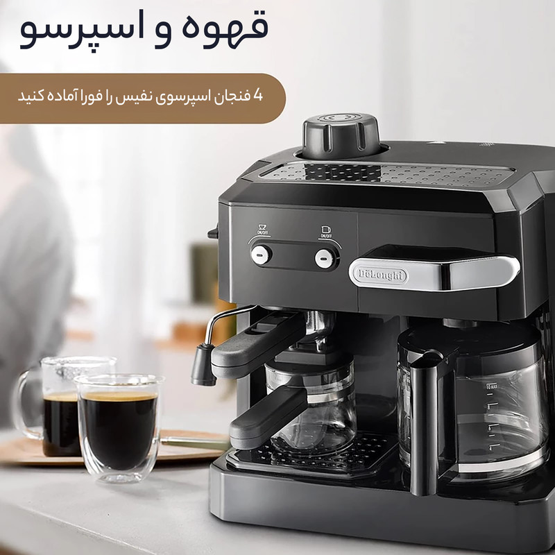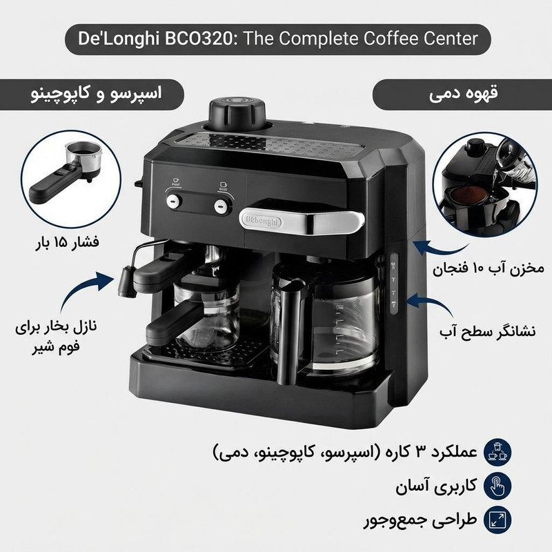 اسپرسوساز ترکیبی دلونگی مدل BCO320 یک دستگاه حرفهای و کاربرپسند است. این دستگاه با توان ۱۷۰۰ وات و فشار بخار ۱۵ بار قادر است انواع نوشیدنیهای قهوه مانند اسپرسو، کاپوچینو و کافه لاته را با طعم و عطر عالی آماده کند. سیستم کاپوچینو ساز آن با ترکیب بخار، هوا و شیر، فومی غلیظ و کرمی تولید میکند که برای کاپوچینو و لاته بینظیر است. این دستگاه دارای سیستم پر کردن جلو است که امکان پر کردن آب و قهوه از قسمت جلویی دستگاه را بدون جابجایی آن فراهم میکند، بنابراین استفاده از آن بسیار راحت و عملی است. مخزن آب با ظرفیت ۲ لیتر، برای تهیه تعداد زیادی فنجان قهوه کافی است و فیلتر پیشرفته آن، کیفیت آب و قهوه را تضمین میکند. علاوه بر این، دستگاه دارای سینی چکهگیر و سیستم گرم کردن فنجان است که تجربه نوشیدن قهوه را لذتبخشتر میکند. طراحی جمع و جور و رنگ مشکی دستگاه، زیبایی خاصی به آشپزخانه شما میبخشد و با ابعاد مناسب به راحتی در هر فضایی قرار میگیرد. اسپرسوساز دلونگی BCO320 برای علاقهمندان به قهوه، دستگاهی ایدهآل است.