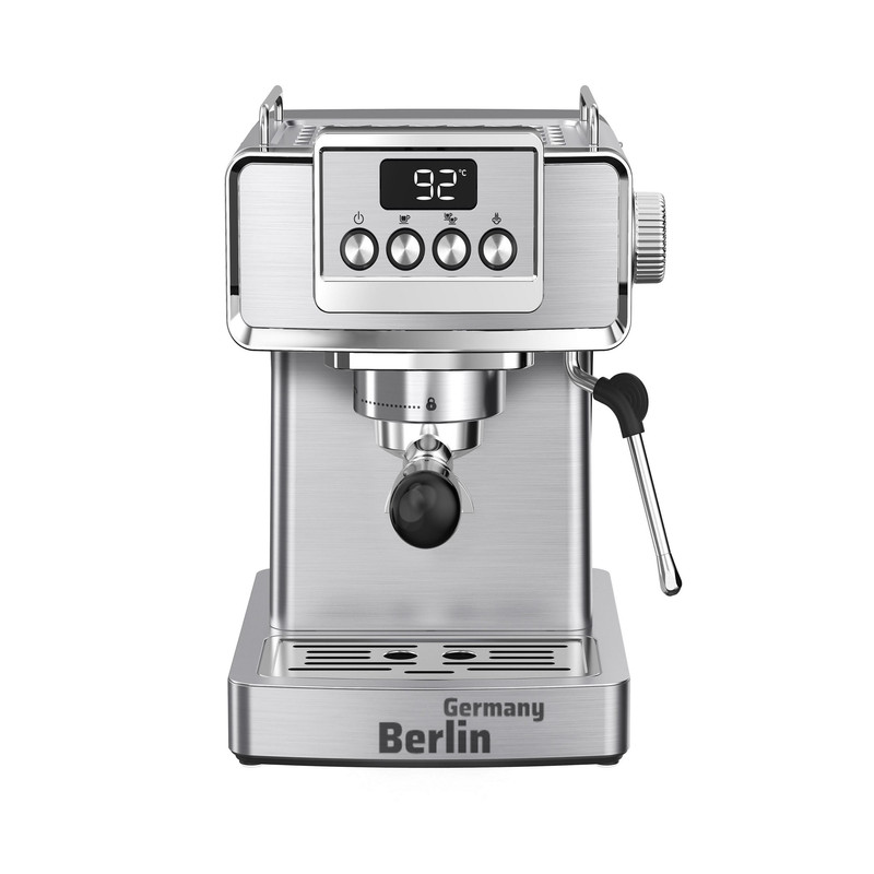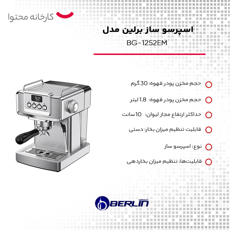 اسپرسوساز برلین Berlin مدل bg-1252یک دستگاه حرفهای و نیمه صنعتی با طراحی عالی و یک دستگاه پر قدرت و کاملاً کاربردی است.این مدل امکانات متنوع و بسیار کاربردی را در اختیار کاربر قرار میدهد و میتواند گزینهای مناسب برای کافیشاپها و رستورانها باشد.اسپرسوساز برلین مدل 1252 با نشانگر درجه فشار بخار از یک گروپ دبل شات تشکیل شده و بهطور کلی میتواند دو فنجان قهوه را به صورت همزمان آماده مصرف کند. این دستگاه دارای توان مصرفی 2200 وات و فشار بخار 28 بار است. اسپرسو خارج شده از این دستگاه با گرمای عالی نشان دهنده ی قدرت بسیار خوب برلین است. همچنین این مدل مجهز به خروجی بخارمتحرک و قابل تنظیم جداگانه با کارایی آسان و راحت است. اسپرسوساز برلین با ارتفاع مناسب و سینی مخصوص امکان استفاده از لیوانهای کوتاه و بلند را به راحتی برای شما ممکن کرده است. صفحه گرم نگهدارنده از دیگر ویژگیهای کاربردی و مهم این محصول است که با استفاده از آن می توانید فنجان را برای مدت بیشتری گرم نکه دارید و از سرو یک اسپرسو مطبوع بیشتر لذت ببرید. این مدل از محصولات برلین دارای نازل بخار چرخشی است که استفاه از آن را آسانتر کرده است. همچنین ظرفیت آب بیشتری نسبت به سایر مدلهای پیش از خود دارد. این دستگاه قابلیت تنظیمکردن ( ست کردن ) تایمر دارد به گونه ای که با فشار دادن و گرفتن هر کدام از کلید ها شما می توانید تایمر را بمدت زمان دلخواه تنظیم کنید ( ست ) کنید . روش کار به این صورت می باشد که اگر یک لیوان آب جوش بمدت 15 ثانیه پر شود شما میتوانید با ست کردن کلید آب جوش روی 15 ثانیه با یک بار فشردن کلید اب جوش یک لیوان کامل آب جوش داشته باشید . یکی دیگر از قابلیت های خوب این دستگاه (سلف کلینینگ ) می باشد که با گذاشت شناور مخصوص در دسته گروپ -(نازل) دستگاه به طورر خودکار سبد قهوه ( بسکت ) را تمیز کرده و از طریق لوله بخار خروجی مانده قهوه را خارج می کند . مورد بعد می توان به داشتن دو لوله مجزا یکی برای بخار ودیگری برای اب جوش اشاره کرد که استفاده زیادی در کافی شاپ ها دارد ومیتوان به طور مجزا آب جوش و بخار از دستگاه گرفت