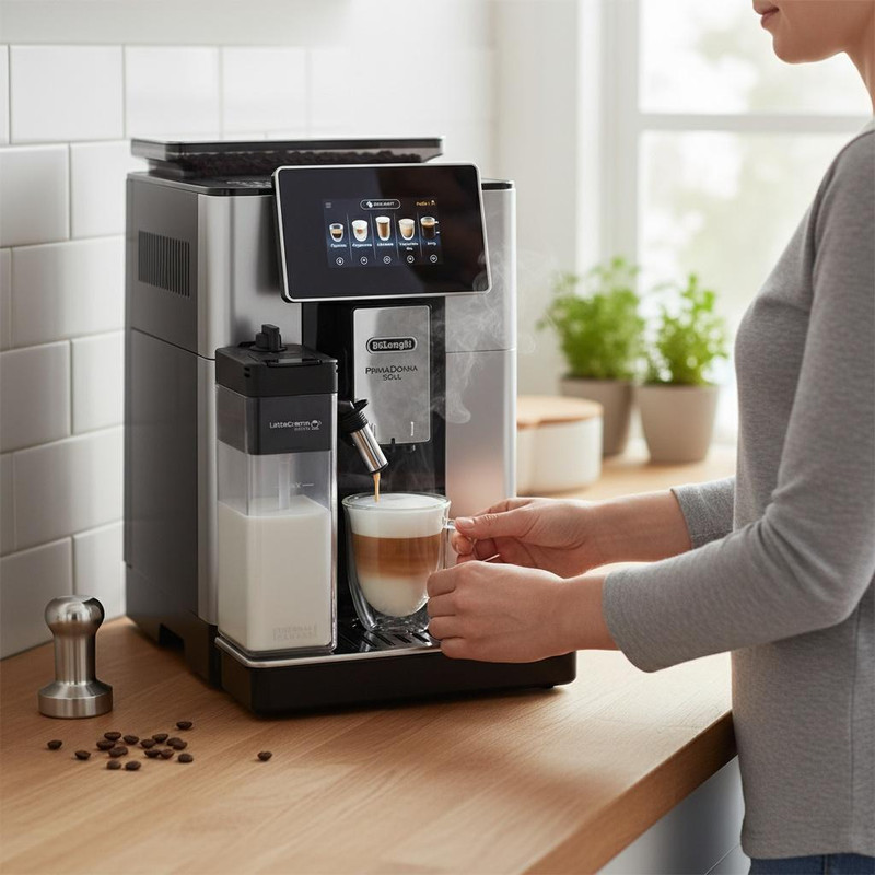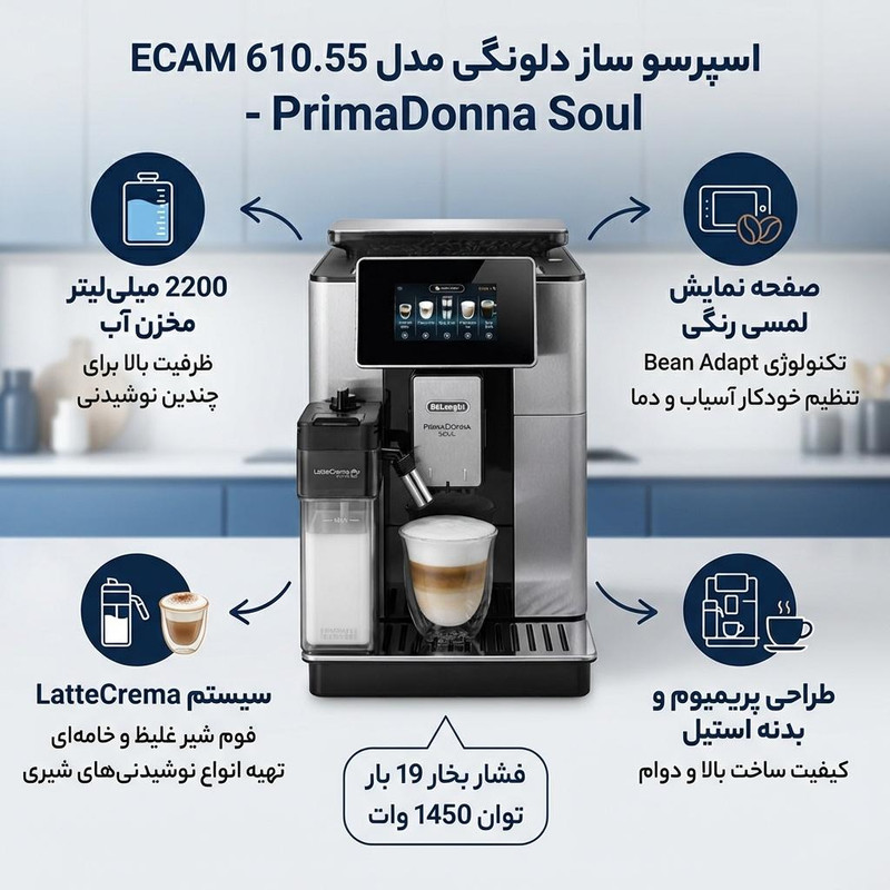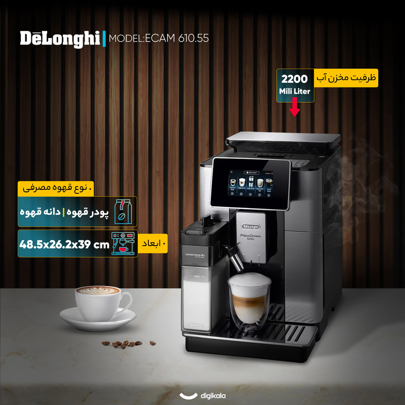 اسپرسوساز دلونگی مدل ECAM 610.55 یکی از پیشرفتهترین دستگاههای خانگی برند De’Longhi است که برای علاقهمندان قهوه حرفهای طراحی شده است. این دستگاه با ترکیب فناوری هوشمند، طراحی مدرن و عملکرد دقیق، تجربهای نزدیک به باریستاهای حرفهای را در محیط خانه فراهم میکند. بدنه اسپرسوساز ترکیبی از پلاستیک مقاوم و استیل براق است که علاوه بر دوام بالا، جلوهای لوکس به آشپزخانه میبخشد. ابعاد دستگاه ۴۸.۵x۲۶.۲x۳۹ سانتیمتر و وزن آن حدود ۱۴.۶۴ کیلوگرم است که تناسب خوبی میان ظرفیت، قدرت و فرم ایجاد کرده است.
