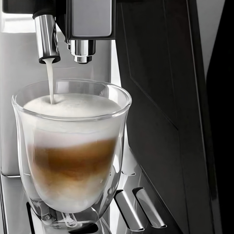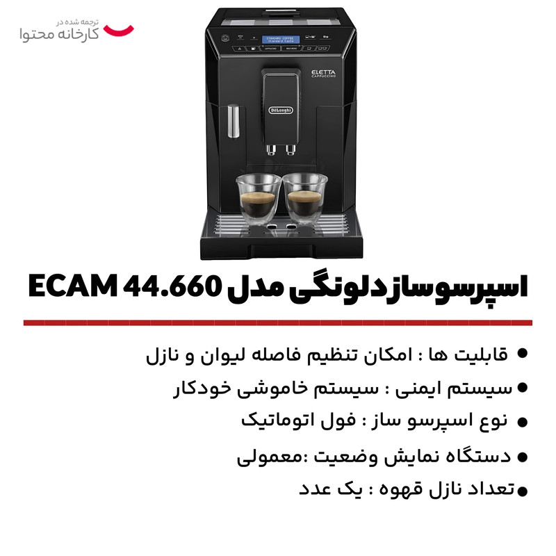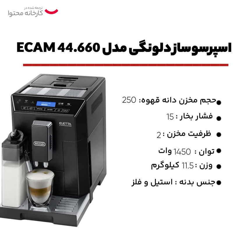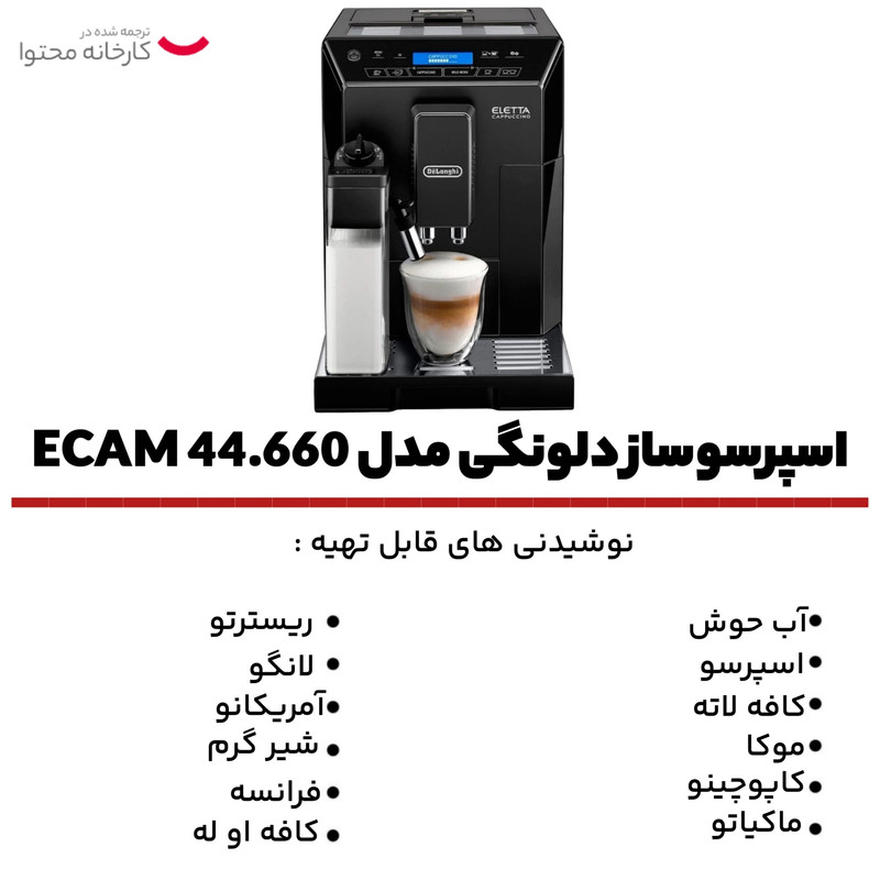 اسپرسوساز دلونگی مدل ECAM 44.660 Eletta Cappuccino ساخت ایتالیا به شما تجربه نوشیدن یک قهوه ایتالیایی را میدهد. به لطف نوآوری جدید میکروفوم LatteCrema و همچنین فن آوری پیشرفته thermoblock از انواع نوشیدنی های قهوه و شیرو ملایمترین اسپرسوها لذت میبرید. پنل لمسی این ماشین قادر به ارائه 3 مدل نوشیدنی به صورت مستقیم تنها با لمس یک دکمه ، شامل : کاپاچینو، لانگ کافی و اسپرسو است و همچنین با استفاده از دکمه منو شیر (MILK MENU) شما به نوشیدنیهای کافه لاته ، اسپرسو ماکیاتو ، فلت وایت ، هات میلک و عملگر MY MILK دسترسی دارید. عملگر MY MILK به شما امکان شخصی سازی و ذخیره تظیمات نوشیدنیتان را میدهد.