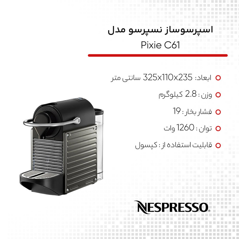 اسپرسوساز «نسپرسو» مدل «Pixie C61»، دستگاهی محبوب است که با ظاهری زیبا و حجمی کوچک میتواند قهوهی اسپرسوی بسیار خوشطعمی تولید کند. این دستگاه توسط کپسولهای اسپرسوی شرکت نسپرسو تغذیه میشود و در پشت آن، مخزن آب قرار دارد. در زمان کوتاهی آب بخار شده و با فشار از میان مواد درون کپسول نسپرسو عبور میکند و با آن ترکیب میشود. پس از مدت کوتاهی اسپرسو آماده شده و داخل لیوان یا استکان مخصوص سرو ریخته میشود. کیفیت بالای کپسولهای نسپرسو طعم دلچسبی ایجاد میکند که کمتر کسی است که از آن راضی نباشد. زیر لیوان و زیر خروجی دستگاه ، ظرف جمعآوری چکه و مایع قرار دارد تا محل استفاده تمیز باقی بماند. بدنهی این دستگاه ترکیبی از فلز و پلاستیک است که ظاهری مدرن به آن میبخشد و در تمامی دکورها و آشپزخانهها قابلاستفاده است. نسپرسو شرکتی اقماری از مجموعه شرکتهای گروه نستله است که سالهاست با تولید دستگاههای اسپرسوساز، کاپوچینوساز و... کمک شایانی به دوستداران قهوه کرده است تا بهراحتی انواع نوشیدنیهای گرم را تهیه کنند و راضی باشند. پیکسی در رنگ خاکستری، بدنه ای راه راه و زیبا دارد.