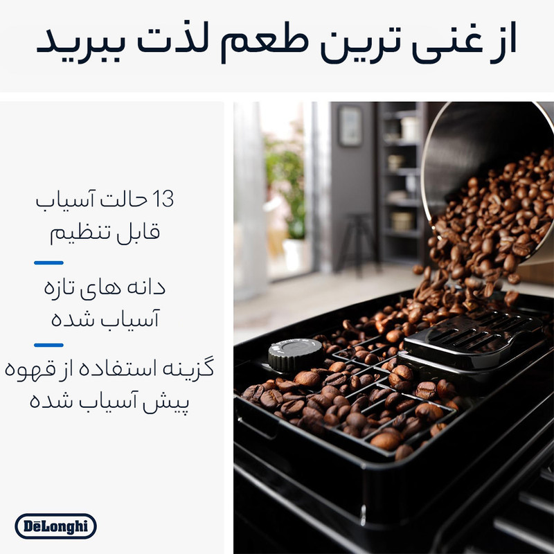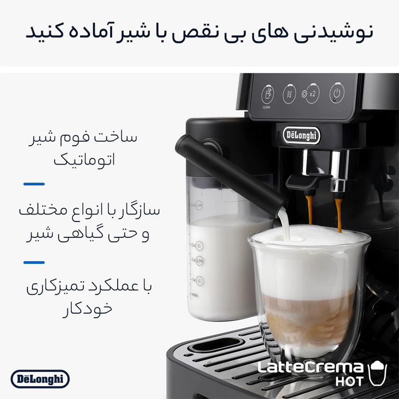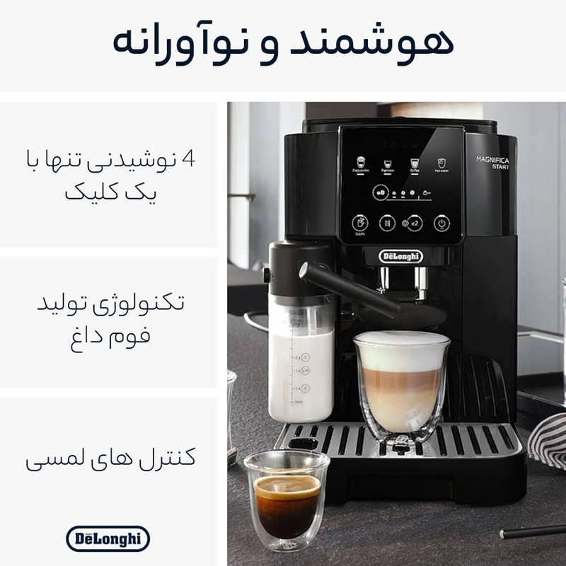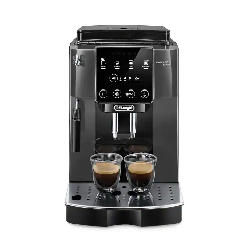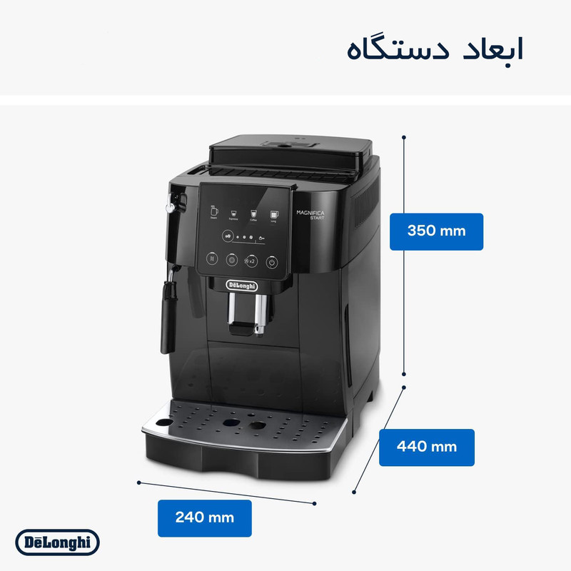 اسپرسوساز دلونگی مدل Magnifica Start کد 220.22 در رنگ (خاکستری-مشکی) و سری 222.20 به صورت تمام مشکی رنگ تولید شده است. آسیاب قهوه 13 حالته در کنار مخزن دان قهوه 250 گرمی توسط پنل با دکمه های لمسی به راحت ترین شکل اسپرسوی شما را با یک لمس آماده میکند. نازل بخار دستگاه نیز برای تهیه فوم شیر به سبک یک باریستا در خدمت شماست. این دستگاه مناسب برای کسانی است که سادگی عملکرد برایشان مهم است. کابل برق این دستگاه از نوع سه شاخه انگلیسی می باشد.