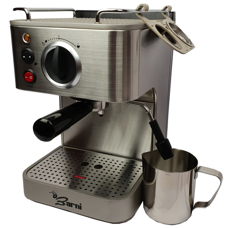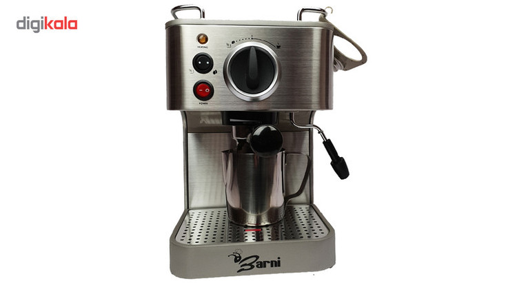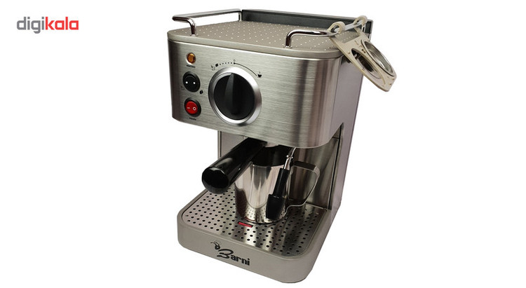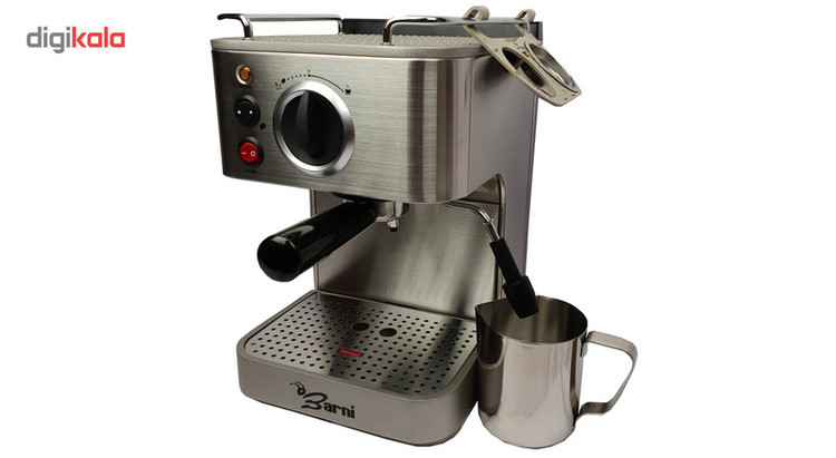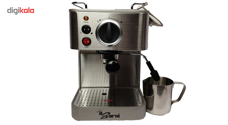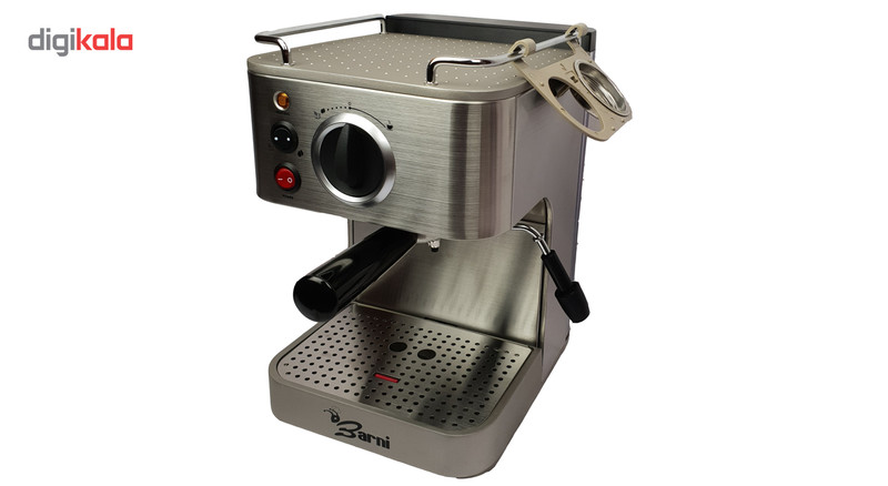 قهوه ساز بارنی Barni با طراحی عالی یک دستگاه پر قدرت و کاملاً کاربردی برای مصارف خانگی و یا کافه های کوچک است.اسپرسو ساز بارنی با تولید 19 بار فشار یک قهوه ساز و اسپرسو ساز قوی محسوب می شود. اسپرسو خارج شده از این دستگاه با کرمای عالی نشان دهنده ی قدرت بسیار خوب بارنی است. قهوه ساز بارنی مجهز به نازل تولید بخار و آب جوش است که از آن برای تهیه کاپوچینو و کف شیر و انواع نوشیدنیهای گرم استفاده میشود نازل خروجی بخار در بارنی قابل چرخش طراحی شده است که استفاده از آن را ساده میکند. اسپرسوساز بارنی مجهز به صفحه ی گرم نگهداره ی فنجان بزرگ است که به شما کمک میکند تعداد بیشتری فنجان قهوه را پیش گرم کنید و از نوشیدن یک فنجان اسپرسو خوب لذت ببرید. بارنی دارای دو فیلتر قهوه تک و دوبل است که شما میتوانید از آنها استفاده کنید. در کنار اسپرسوساز بارنی یک ظرف شیر مخصوص ( پیچر ) ارزشمند به عنوان هدیه قرار دارد که در تهیه کف شیر برای کاپوچینو و لاته آرت میتوان از آن استفاده کرد. در مقایسه این دستگاه با اسپرسو ساز نوا 140 باید به این نکته اشاره کنیم که پورتا فیلتر بارنی بسیار قویتر از دستگاههای مشابه است و قدرت پمپ بارنی نیز 19 بار است که بیشتر از سایر قهوه سازهای مشابه میباشد. علامت و مشخصات اسپرسو بارنی جهت استفاده صحیح 1 دکمه روشن و خاموش دستگاه قرمز رنگ 1/2 چراغ آماده به کار بخار و آبجوش زرد رنگ : زمانی که دستگاه روشن می شود چراغ زرد روشن شده و زمانی که به درجه حرارت مناسب چهت تهیه قهوه برسد بصورت اتوماتیک خاموش می شود. 2 دکمه انتخاب بخار و آبجوش: اگر دکمه را به سمت بخار بفشارید می توانید جهت تهیه کف شیر یا گرم کردن نوشیدنی استفاده کنید و اگر به سمت آبجوش می توانید برای تهیه کاپوچینو ،چای و ... استفائه کنید .