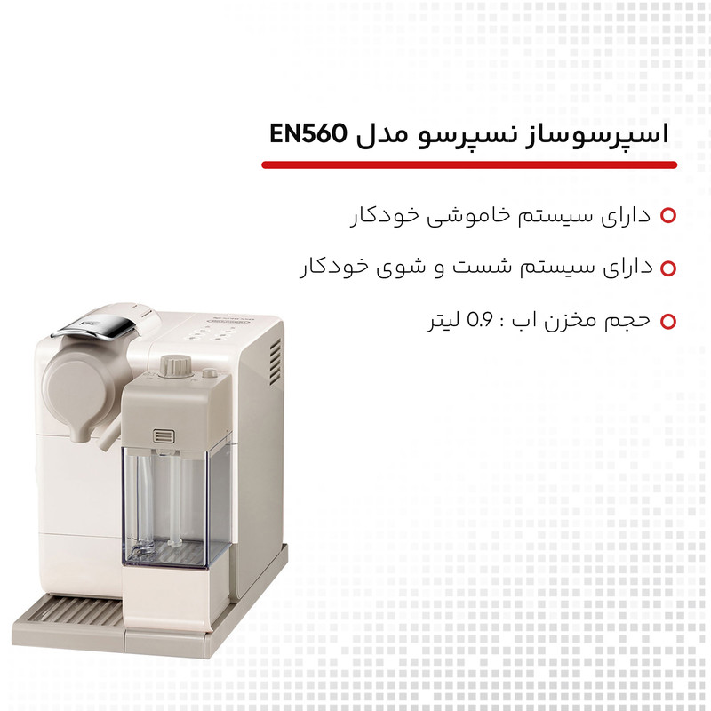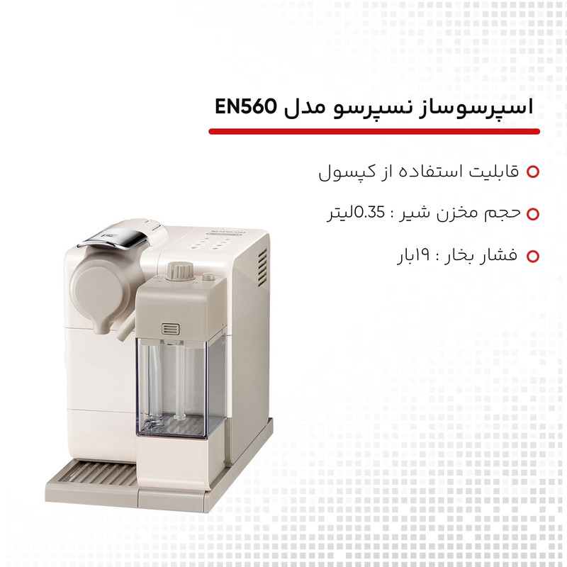بعد از اینکه مدل لاتیسیما تاچ EN 550 با استقبال خیلی خوب در دنیا روبرو شد, نسپرسو سری جدید لاتیسیما تاچ EN 560 را به بازار عرضه کرد.شکل ظاهری فوق العاده زیبا و جذاب و ( دو رنگ مشکی متالیک و کرم ) که چشم هر مخاطبی را به خود جذب می کند. اسپرسوساز نسپرسو سری جدید لاتیسیما تاچ مدل Lattissima Touch-EN560، یک محصول با طراحی منحصربهفرد است. این محصول با وزن 4.5 کیلوگرم، ظرفیت مخزن 0.9 لیتر و فشار بخار 19 بار ساختهشده است. از دیگر مشخصات فنی این محصول میتوان به حالت آمادهبهکار، سینی چکه گیر، دارای تنظیم میزان غلظت قهوه، رسیدن به بالاترین دما تنها در 25 ثانیه، پشتیبانی از انوع کپسول، خاموش شدن بهصورت خودکار بعد از 9 دقیقه، قرار گرفتن در حالت Stand by بعد از 30 دقیقه، توان مصرفی 1400 وات، دارای سیستم قطع خودکار، مناسب برای لیوانهای در اندازهی کوچک و بزرگ، 16 کپسول به همراه محصول به کاربر عرضه میشود.