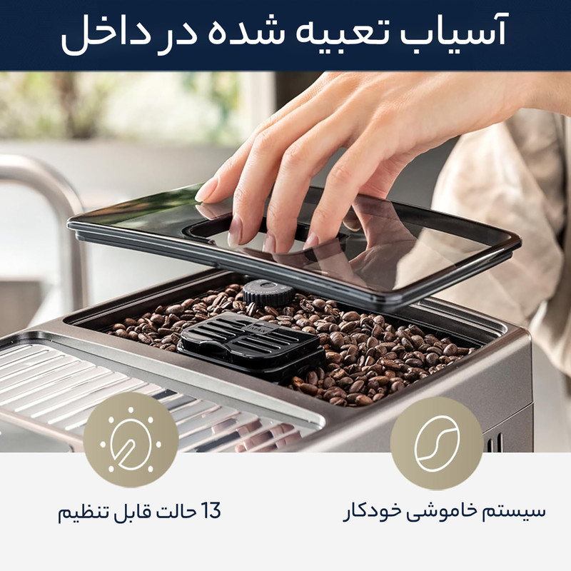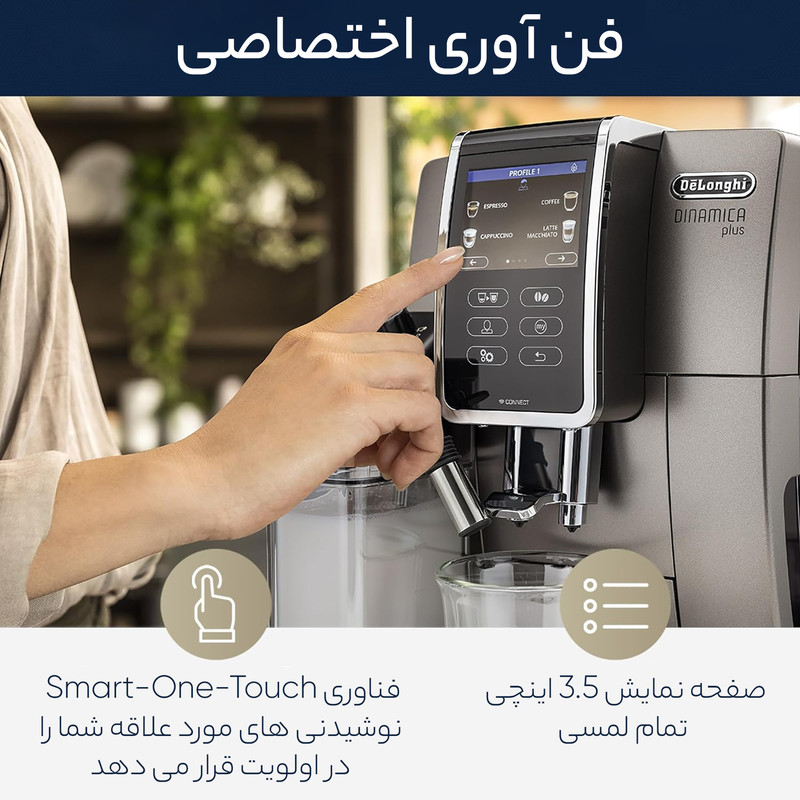 اسپرسوساز Dinamica Plus به راحتی هر زمان که میل اسپرسو داشته باشید تجربه یک کافی شاپ مجهز را برای شما تداعی میکند. صفحه نمایش رنگی با راهنمای کامل راه اندازی از صفر تا 100 شما را بی نیاز از هر گونه باریستا میکند تا به راحتی و با یک لمس بهترین نوشیدنی های قهوه را داشته باشید. آسیاب 13 حالته نیز داخل دستگاه گنجانده شده تا عطر و طعم قهوه را همان ابتدا به بهترین شکل تجربه کنید. همچنین امکان اتصال دستگاه به WIFI و قابلیت کنترل از روی تلفن همراه برای سفارشی سازی قهوه مورد نظر خود شما را شگفت زده خواهد کرد. به لطف رابط کاربری جدید و بصری در نمایشگر رنگی لمسی 3.5 اینچی TFT از تعامل آسان لذت ببرید. با استفاده از سیستم لمسی هوشمند ، Dinamica Plus برنامه ریزی شده تا بیشترین نوشیدنی های انتخاب شده شما را به ثبت برساند و به طور خودکار آنها را به عنوان اولین در پانل انتخاب شما لیست کند. سیستم ترموبلاک پیشرفته برای گرم کردن آب در دمای ایده آل برای تهیه قهوه در این دستگاه قرار گرفته است. همچنین سیستم منحصر به فرد LatteCrema از یک دستگاه اختلاط استفاده می کند که بطور خودکار یک کف شیر متراکم ، غنی و ماندگار را فراهم می کند - دقیقاً مانند یک باریستای حرفه ای در کافی شاپ. آسیاب فلزی مخروطی بهترین استخراج طعم و عطر را تضمین می کند. سیستم بدون لوله آسیاب مقدار خاک قهوه ای را که در مدار آسیاب قرار دارد را کاهش می دهد تا هر بار تازه ترین پودر را داشته باشد. با استفاده از دکمه My Function می توانید دستورالعمل ها را به راحتی تهیه و ذخیره کنید تا هر بار از فنجان کامل خود لذت ببرید: تغییر عطر و مقدار قهوه و مقدار شیر و کف را انتخاب کنید.