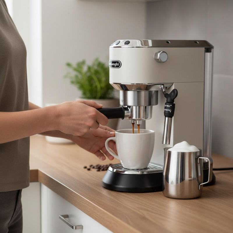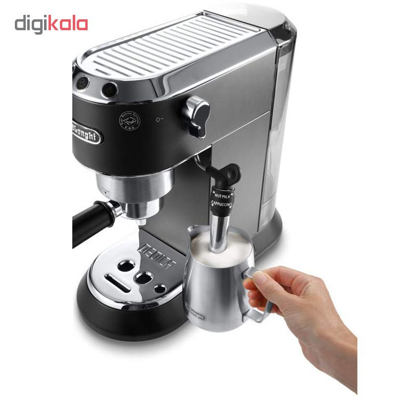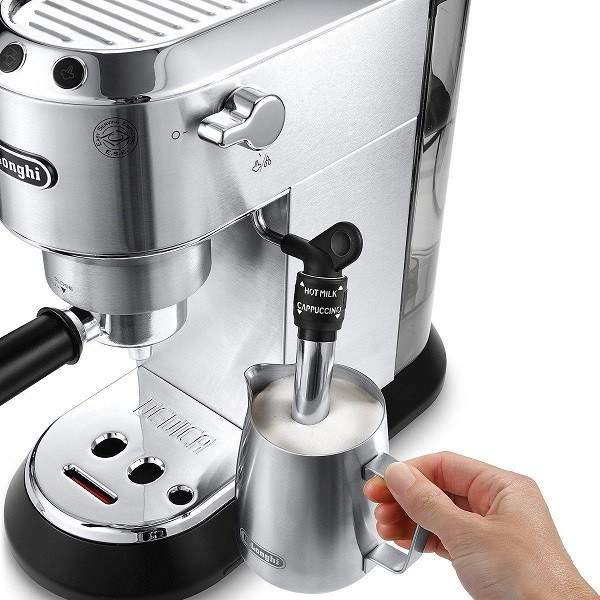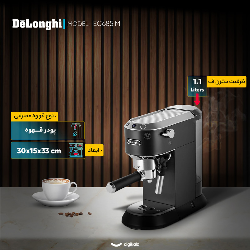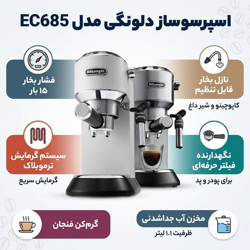 اسپرسو ساز دلونگی مدل EC685پرفروشترین اسپرسوساز برند محبوب دلونگی که بواسطهی زیبایی و جنس خوب بدنه برندی پذیرفتهشده در بین ایرانیان به حساب میآید. این قهوهساز خانگی با طراحی شکیل زیبایی آشپزخانهی شما را تضمین میکند. ابعاد کوچک 35x17x35، وزن 5 کیلوگرمی و جنس بدنه استیل با عمر بالا عامل اصلی محبوبیت این دستگاه دلونگی است. Delonghi ec685 دارای مخرن آب 1.1 لیتری در بخش پشتی است که برای تهیه چندین فنجان قهوه کافی میباشد. توان مصرفی اسپرسوساز دلونگی 1350 وات بوده و فشار بخار در این دستگاه 15 بار است که عدد قابل توجهی برای دستگاه خانگی محسوب میشود . شما علاوه بر اسپرسو میتوانید با کمک بازوی استخراج قهوه و بخار، به راحتی قهوه خود را با کرم صاف و نرمی بدست اورید همچنین لاته، کاپوچینو و آب جوش با این قهوه ساز تهیه کنید. در قسمت زیرین دستگاه سینه چکه گیر وجود دارد که هنگام ریزش مایع، قهوه یا آب، داخل این مخزن ریخته و از کثیف شدن کابینت یا میز شما جلوگیری میکند. این دستگاه دارای پنل گرمکننده در قسمت بالایی، صفحه نمایش LCD و حالت خاموشی خودکار است.
